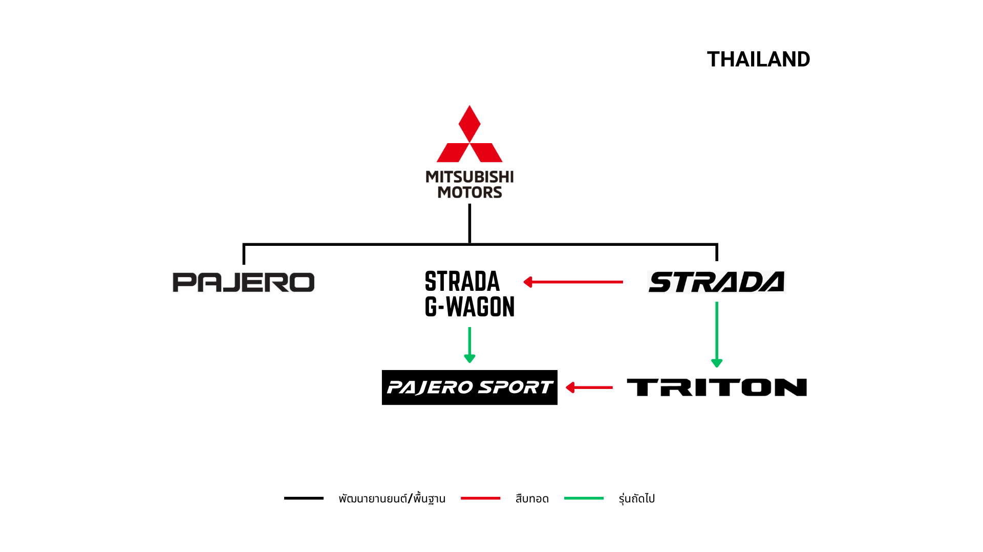 Mitsubishi Pajero Sport รุ่นที่ 1 หรือ Generation 1 นั้นคือ Mitsubishi Strada G-Wagon โดยใช้พื้นฐานของ Mitsubishi Strada หรือ L200 (ชื่อในต่างประเทศ) นำมาดัดแปลง โดยอยู่ในประเภท SUV หรือ PPV (ตามกฎหมายการเสียภาษีในของประเทศไทย) ต่อมา Mitsubishi Motor ได้เปิดตัว Mitsubishi Pajero Sport รุ่นที่ 2 ที่ประเทศรัสเซีย(โดยต้องการไปเจาะตลาดที่นั่น)โดยใช้พื้นฐานบางส่วนจาก Mitsubishi Triton ที่เป็นรุ่นสืบทอดจาก Mitsubishi Strada โดยตรง ซึ่ง Mitsubishi Pajero Sport รุ่นที่ 2 นอกจากใช้พื้นฐานบางส่วนของ Mitsubishi Triton แล้วรูปลักษณ์ภายนอกบางส่วนถอดแบบมาจาก Mitsubishi Pajero Evo (ตัวที่ใช้ลงแข่งขัน Dakar ในปี ค.ศ. 2005 รหัส MPR11) และ Mitsubishi Outlander รุ่นที่ 2